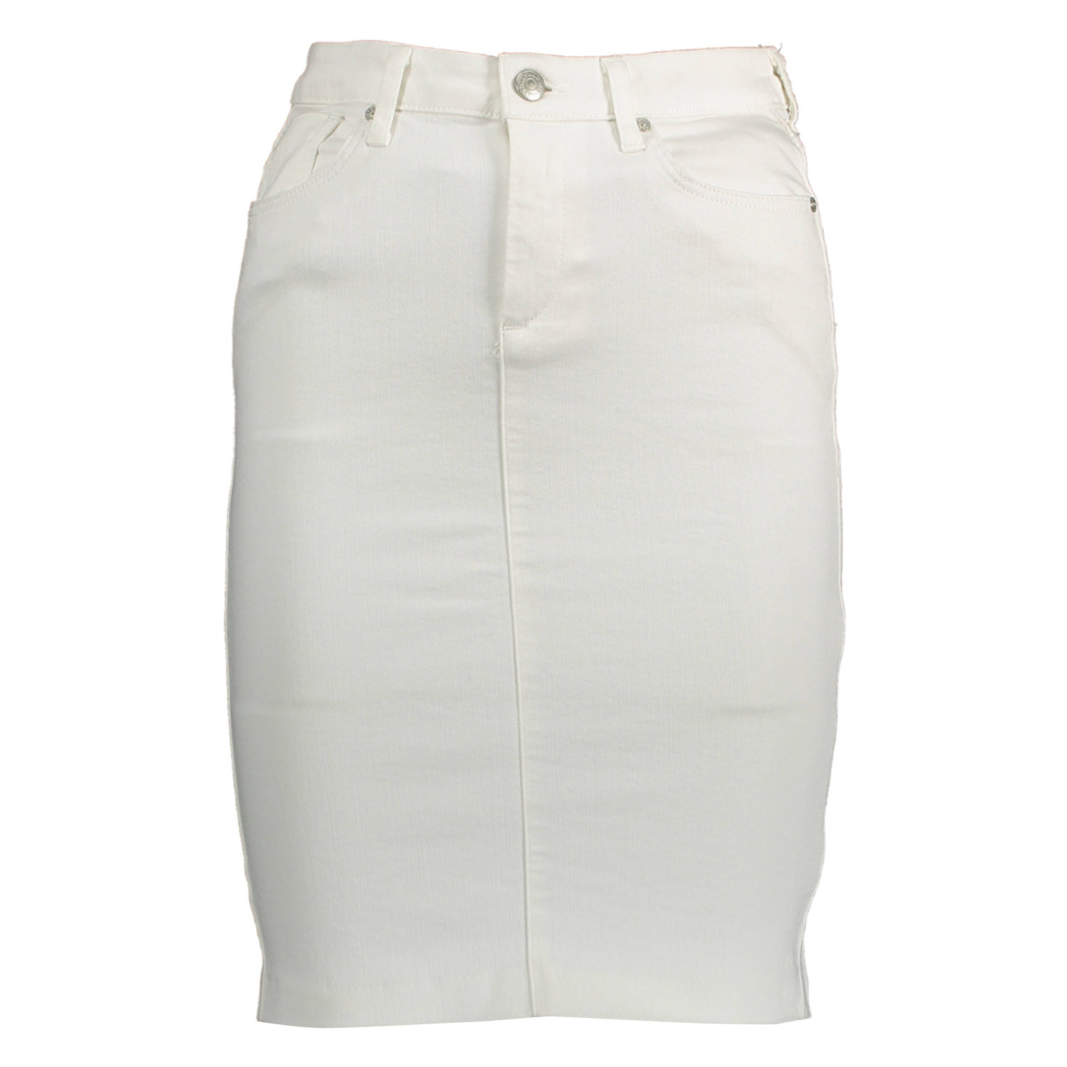 GONNA LONGUETTE IN JEANS, 5 TASCHE, BOTTONE E ZIP, LOGO