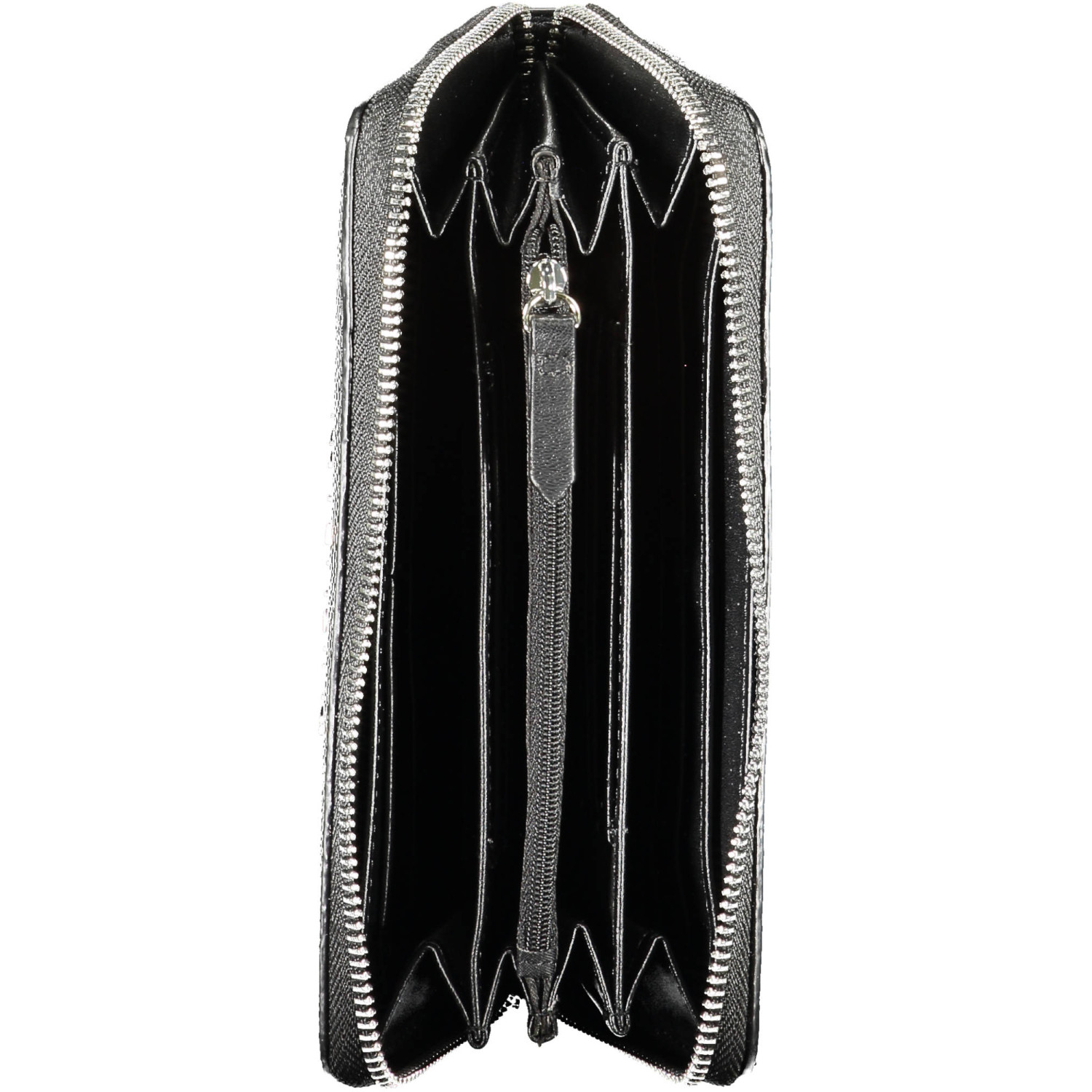portafoglio 4 scomparti, portamonete, spazi interni formato da card, dettagli a contrato, chiusura con zip, logo