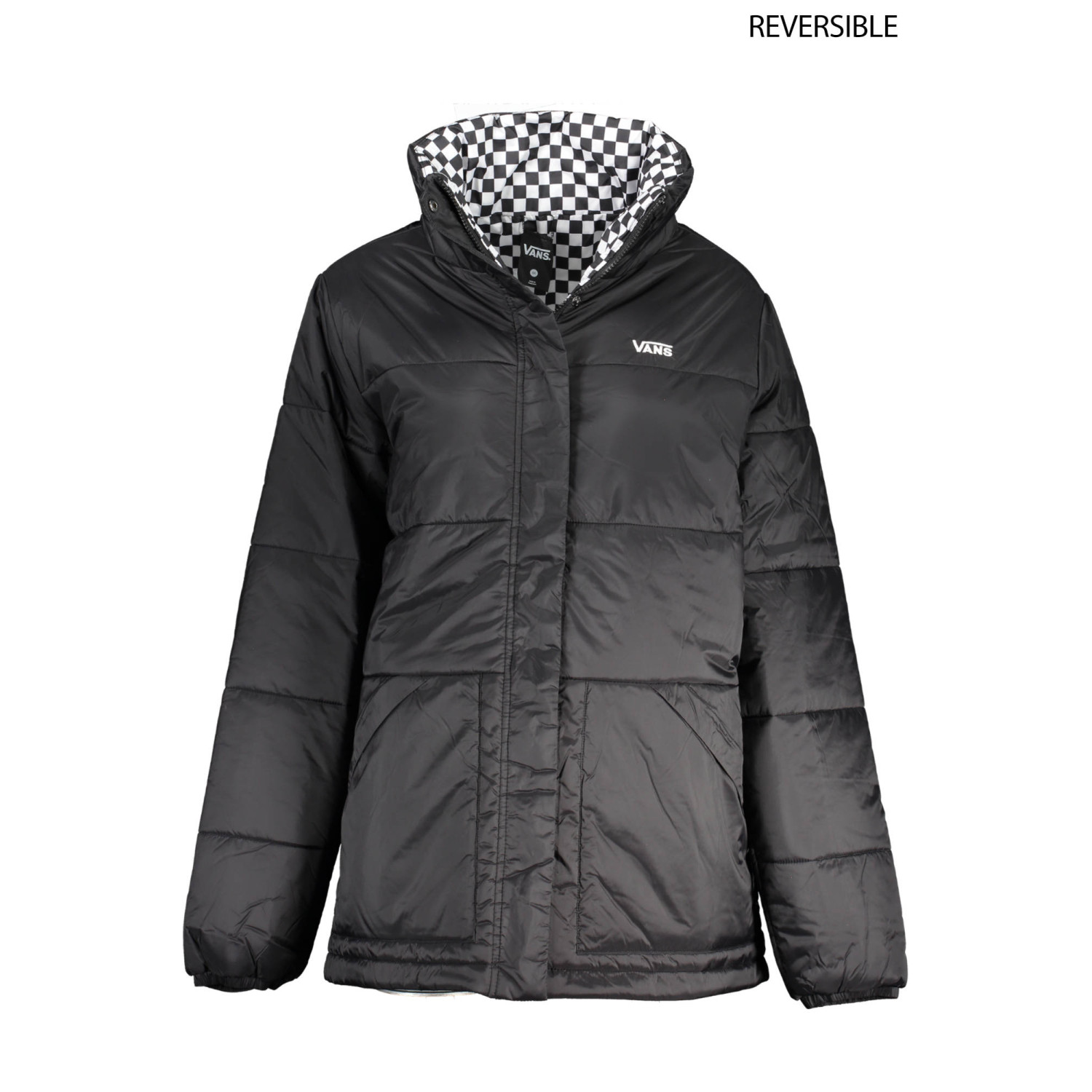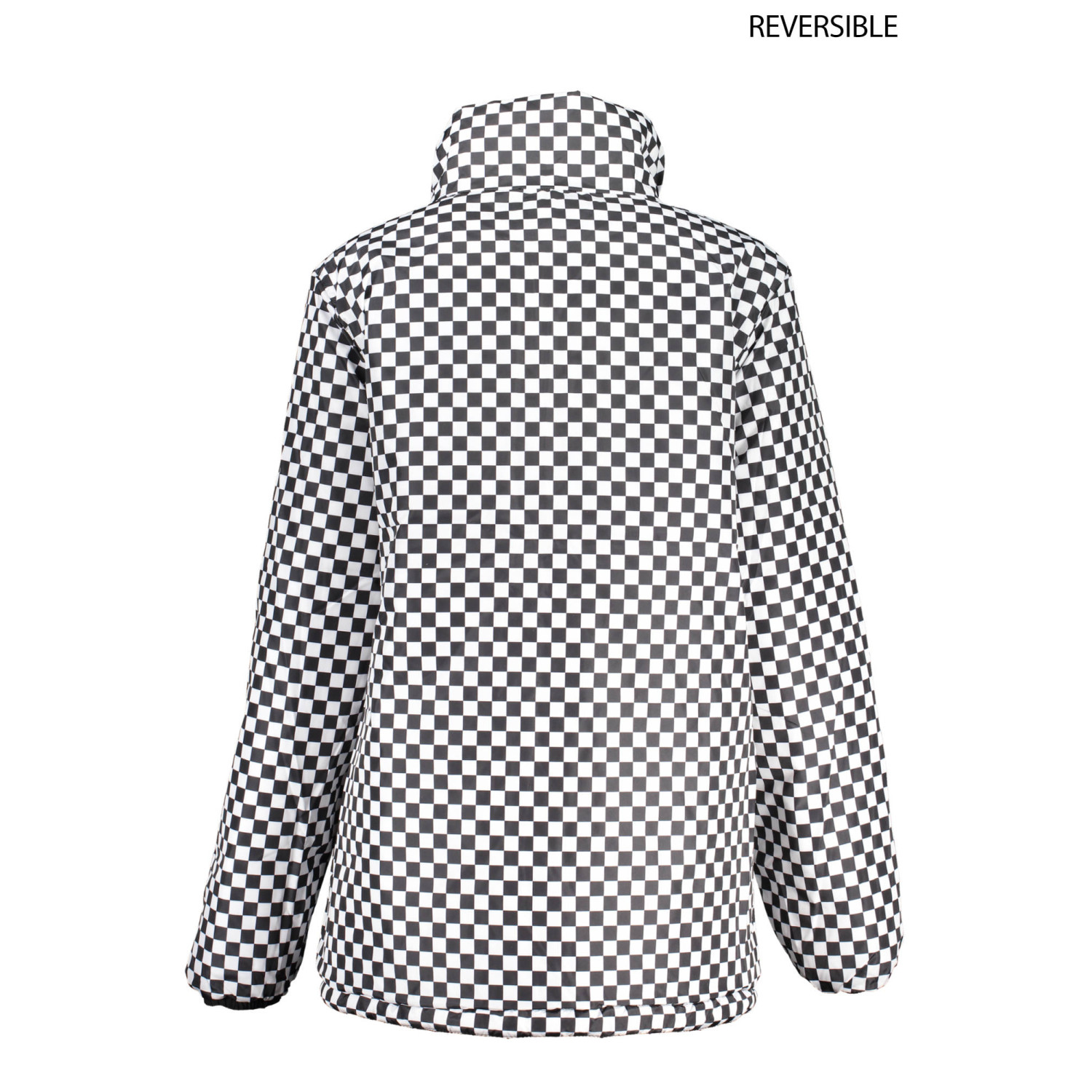 giubbotto maniche lunghe, revesibile, nero/a quadri bianco nero, 2 tasche esterne, 2 tasche interne, bottoni, zip, ricamo, impermeabile, logo