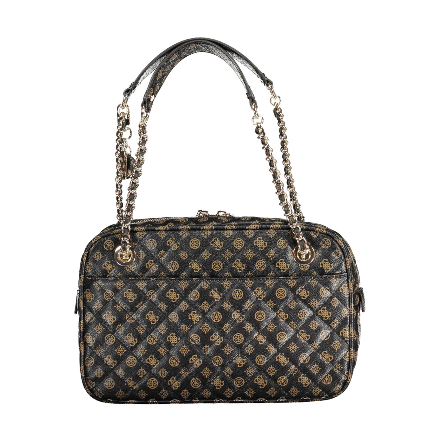 borsa 2 manici a spalla in catena, 2 tasche esterne, 1 tasca interna, spazi interni portadocumenti, dettagli a contrasto, chiusura con zip, logo