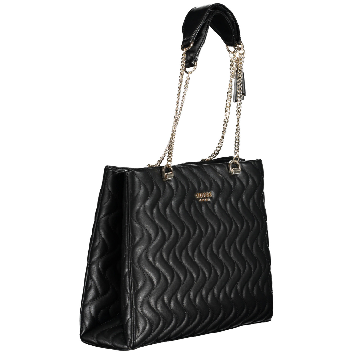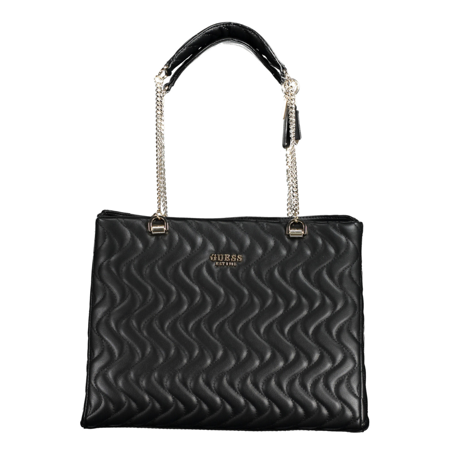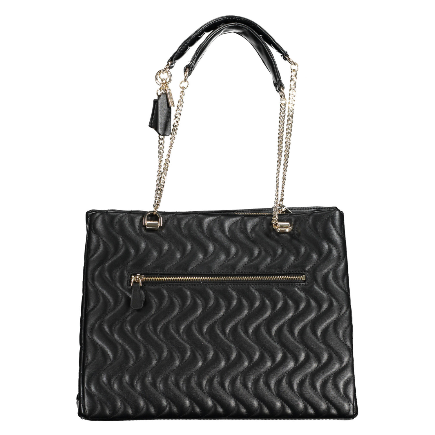 borsa 2 manici a spalla in catena, 1 tasca esterna, 2 scomparti, 1 tasca centrale, 1 tasca interna, spazi interni porta telefono, dettagli a contrasto, chiusura con zip e automatici, logo