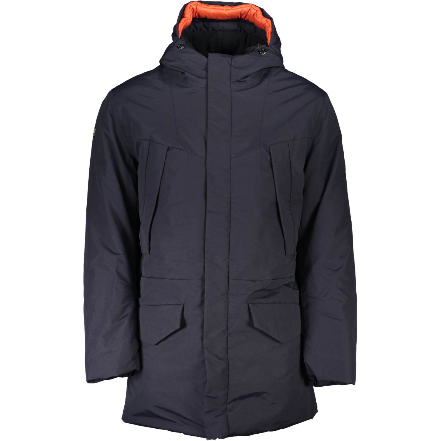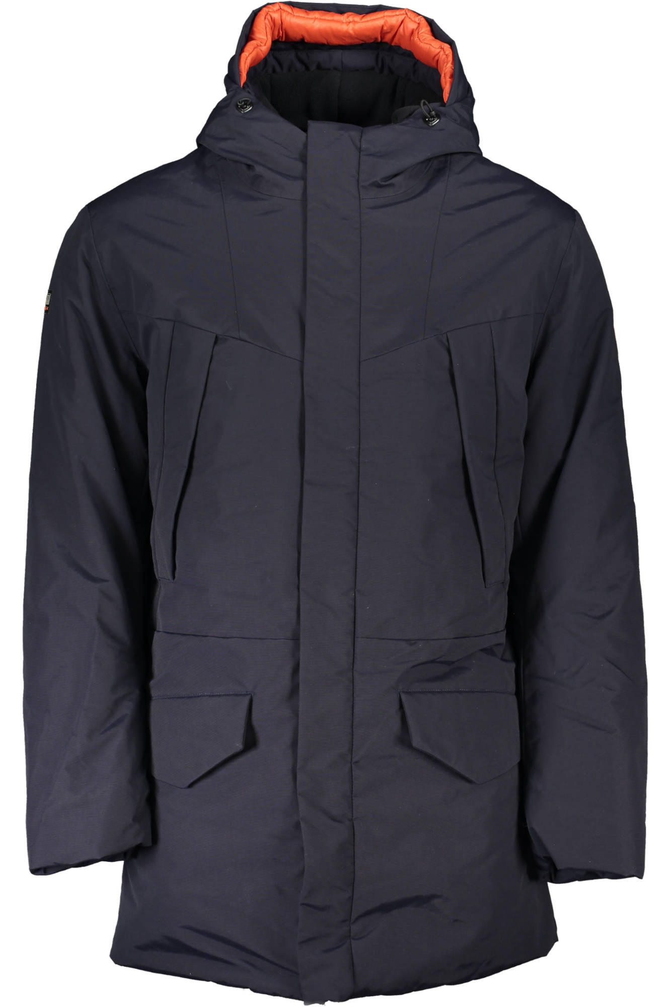 GIUBBOTTO LUNGO MANICHE LUNGHE CON CAPPUCCIO, 4 TASCHE ESTERNE, 1 TASCA INTERNA, APPLICAZIONE, ZIP, BOTTONI, LOGO