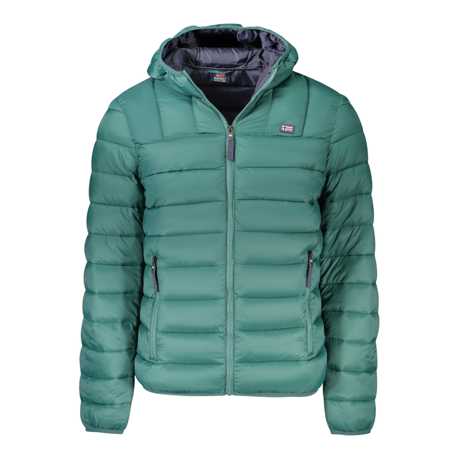 GIUBBOTTO MANICHE LUNGHE CON CAPPUCCIO, 2 TASCHE ESTERNE, DETTAGLI A CONTRASTO IN VERDE, ZIP, APPLICAZIONE, LOGO