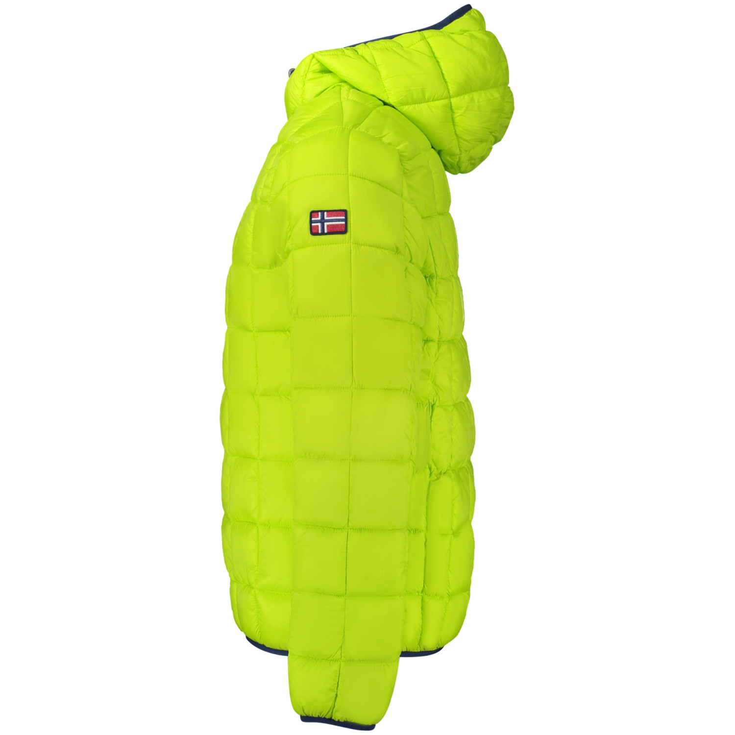 GIUBBOTTO MANICHE LUNGHE CON CAPPUCCIO, REVERSIBILE BLU/VERDE FLUO, 2 TASCHE ESTERNE, 2 TASCHE INTERNE, ZIP, APPLICAZIONE, LOGO