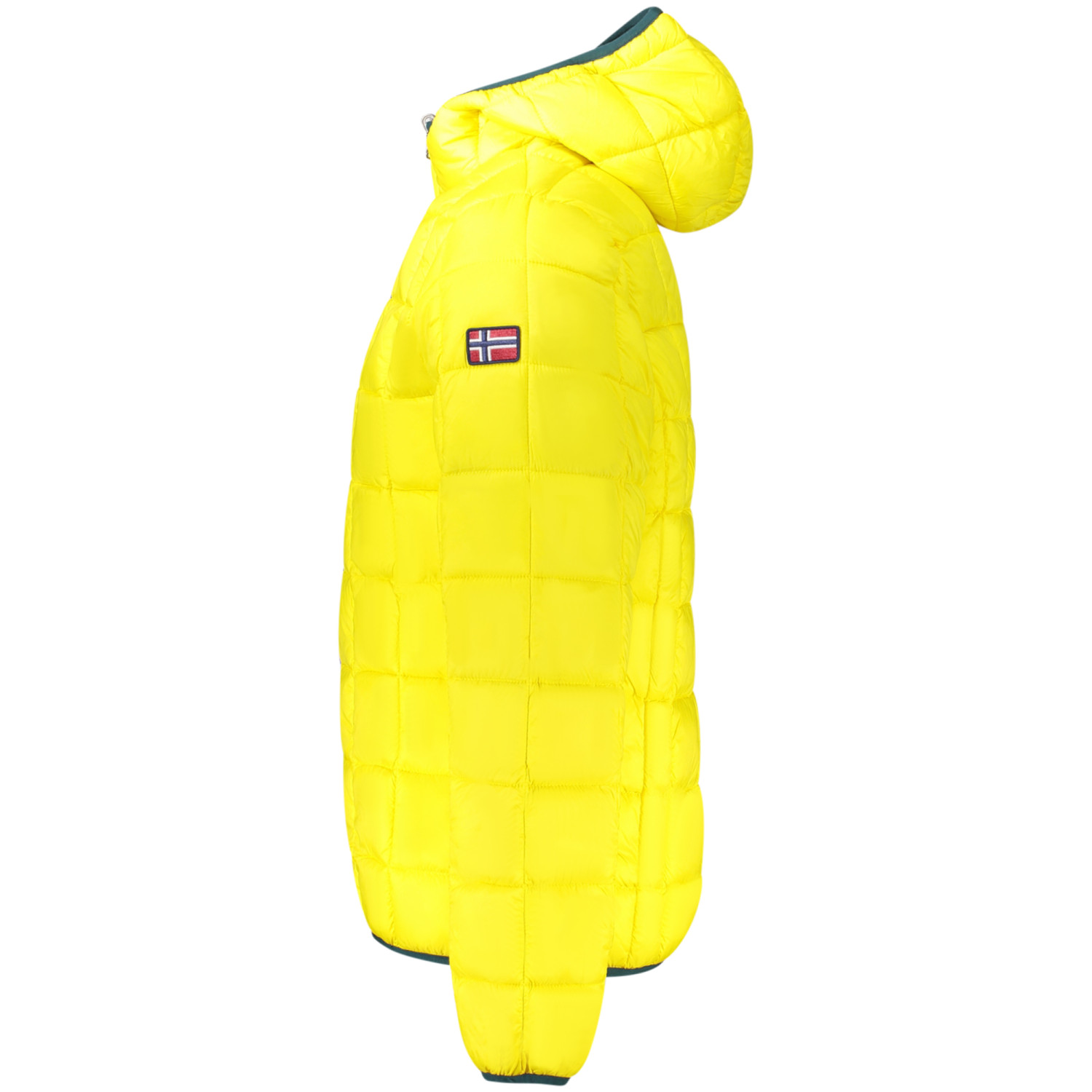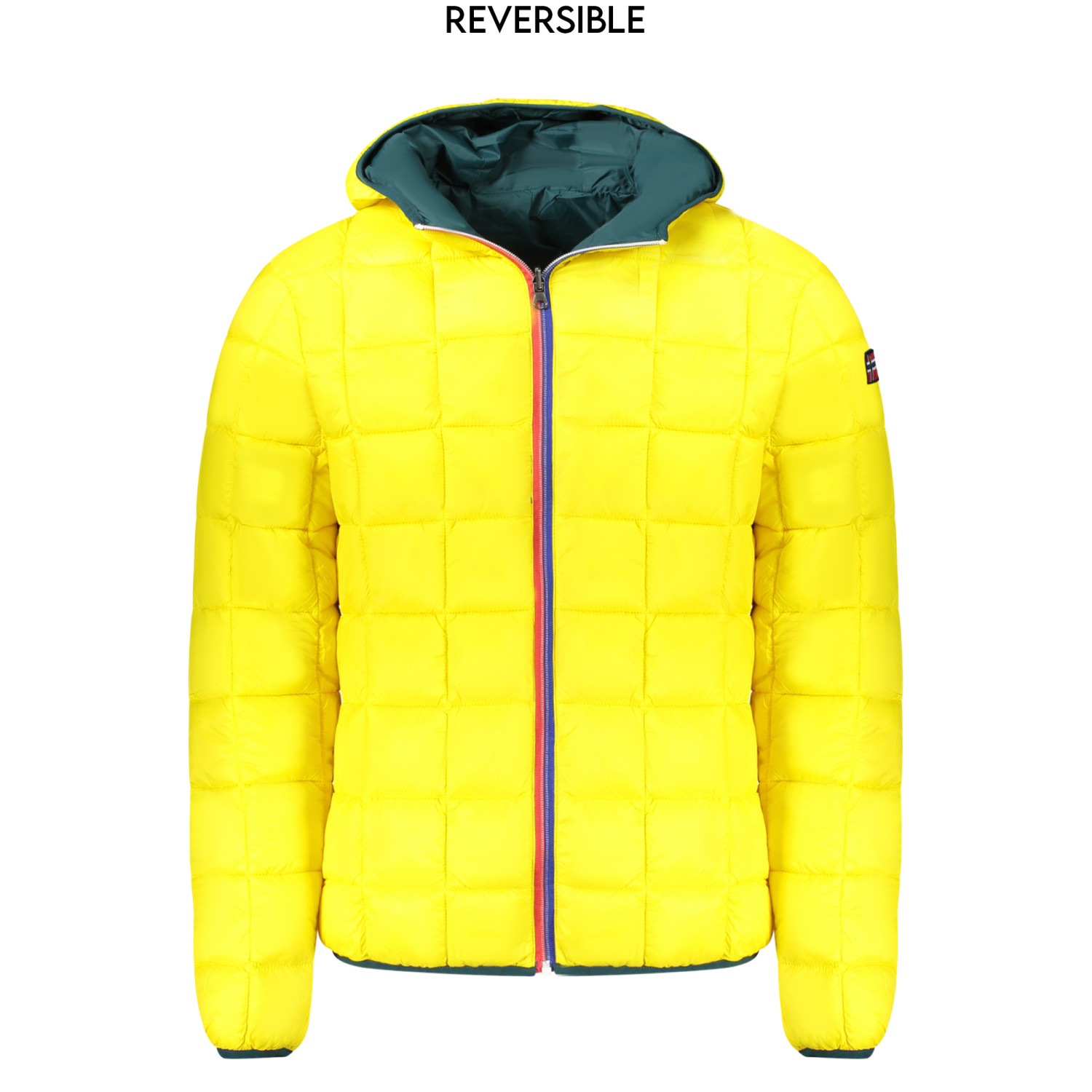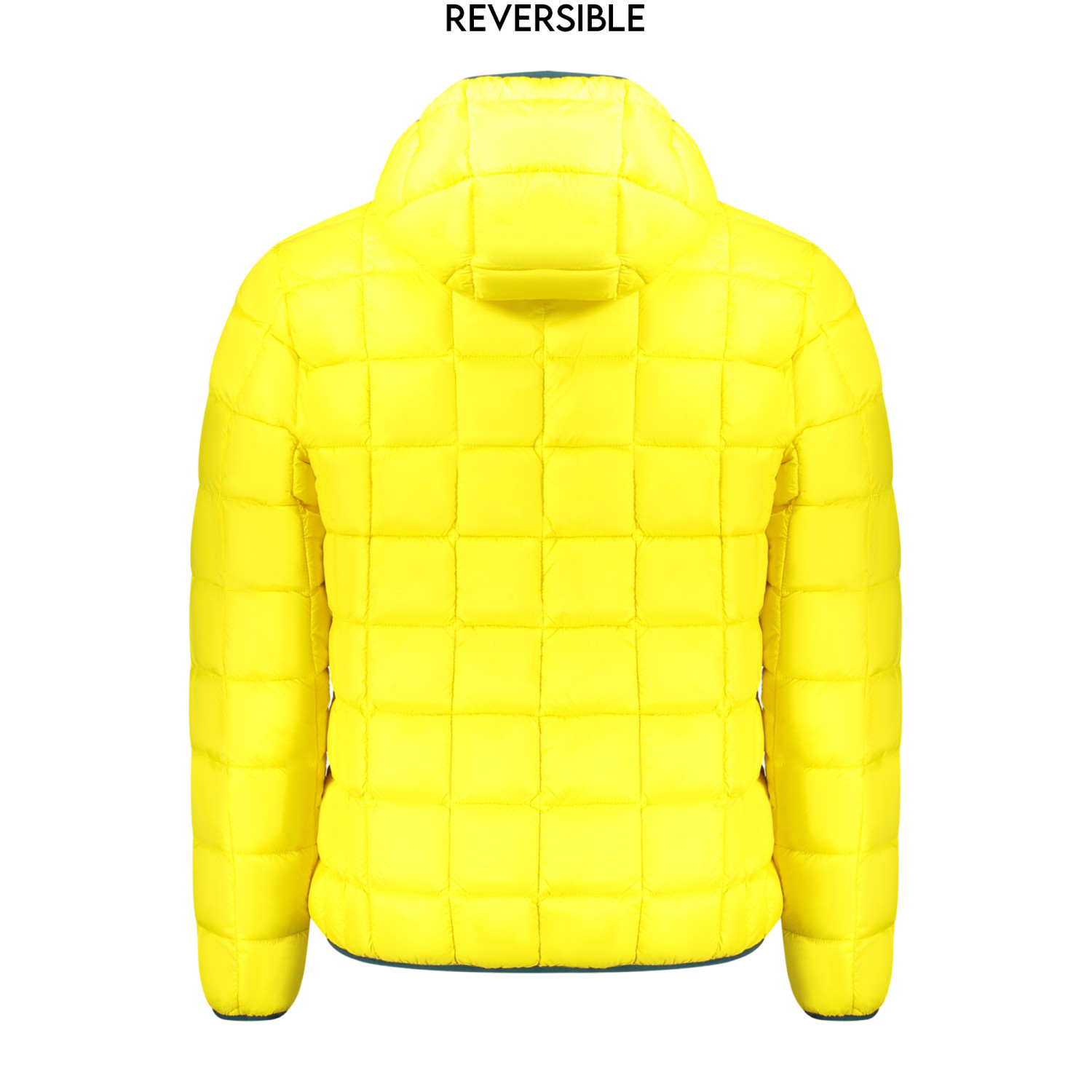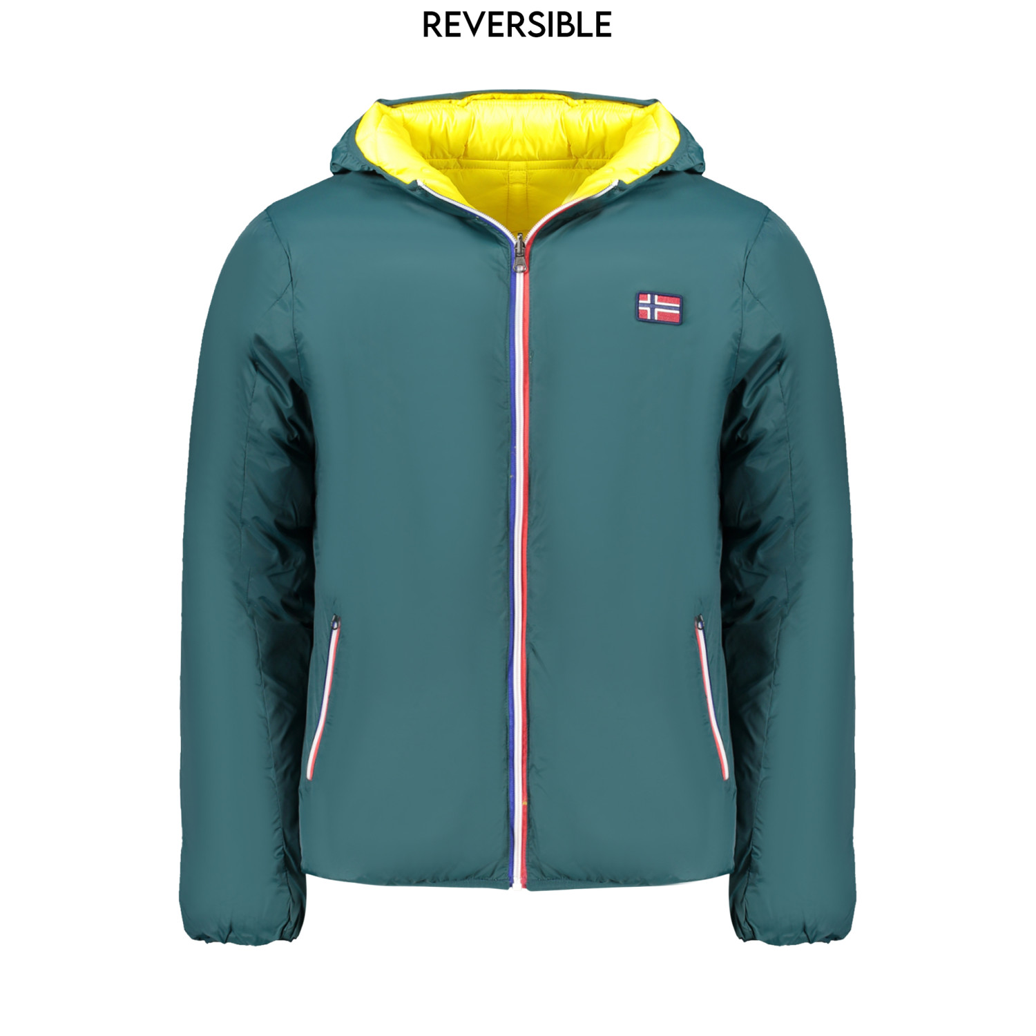 GIUBBOTTO MANICHE LUNGHE CON CAPPUCCIO, REVERSIBILE VERDE/GIALLO, 2 TASCHE ESTERNE, 2 TASCHE INTERNE, ZIP, APPLICAZIONE, LOGO