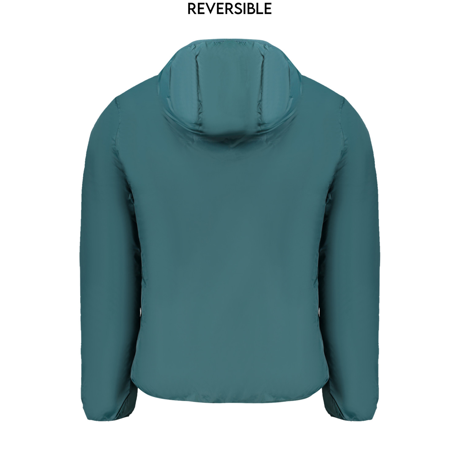 GIUBBOTTO MANICHE LUNGHE CON CAPPUCCIO, REVERSIBILE VERDE/BLU, 2 TASCHE ESTERNE, 2 TASCHE INTERNE, ZIP, APPLICAZIONE, LOGO