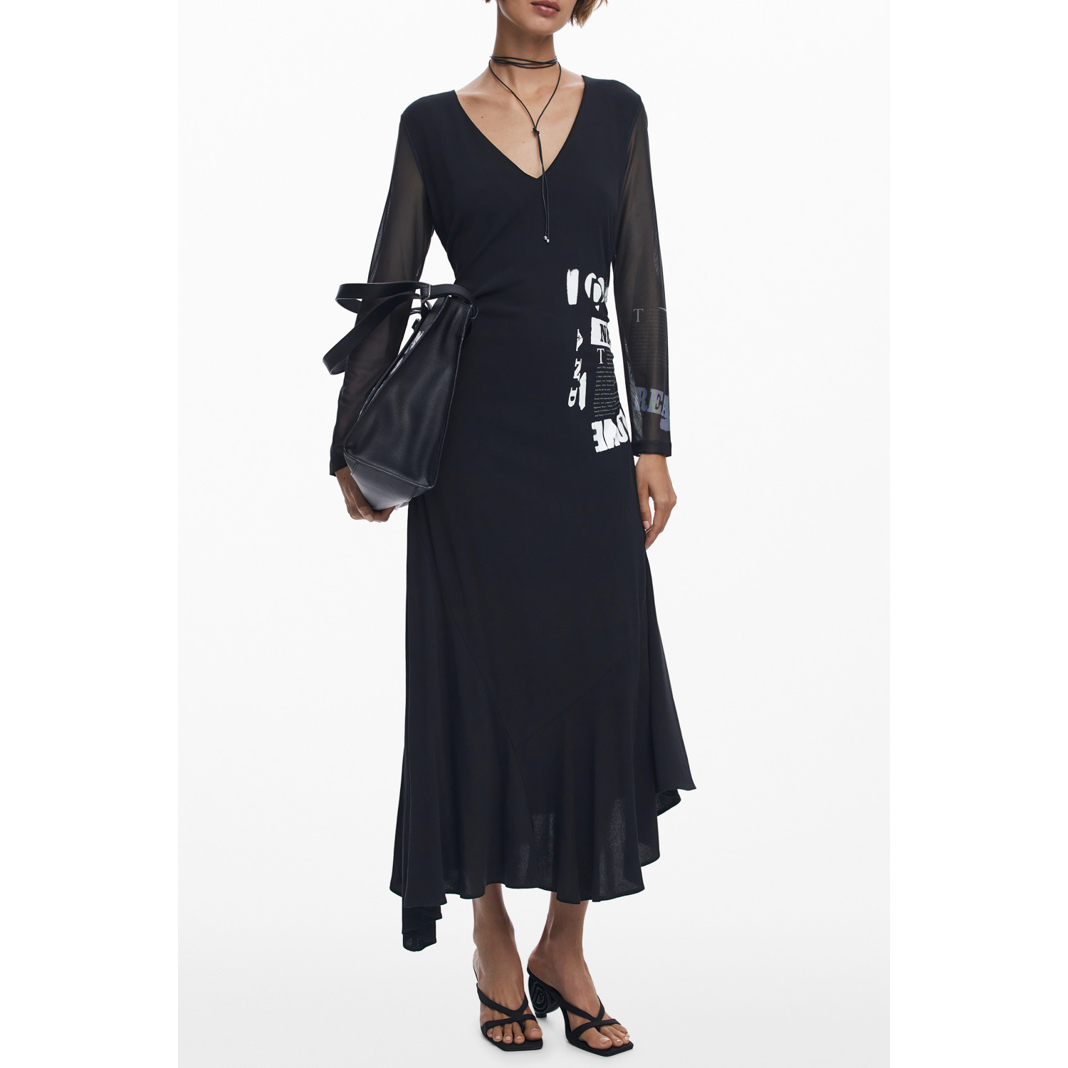 ABITO LUNGO, MANICHE LUNGHE, POSINEW, SCOLLO A "V", CERNIERA SUL RETRO, DETTAGLI A CONTRASTO, LOGO